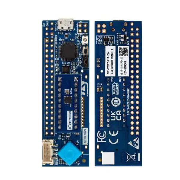 Отладочная плата STM32C0116-DK Discovery Kit – это набор разработчика (development kit) для микроконтроллеров STM32 серии C0. Он содержит все необходимое для начала разработки с STM32C0116, включая саму плату с микроконтроллером, разнообразные датчики, разъемы и интерфейсы связи, такие как GPIO, UART, SPI, I2C, ADC, USB и т.д., которые позволяют подключать разные датчики, устройства и другие электронные компоненты для создания прототипов различных систем.