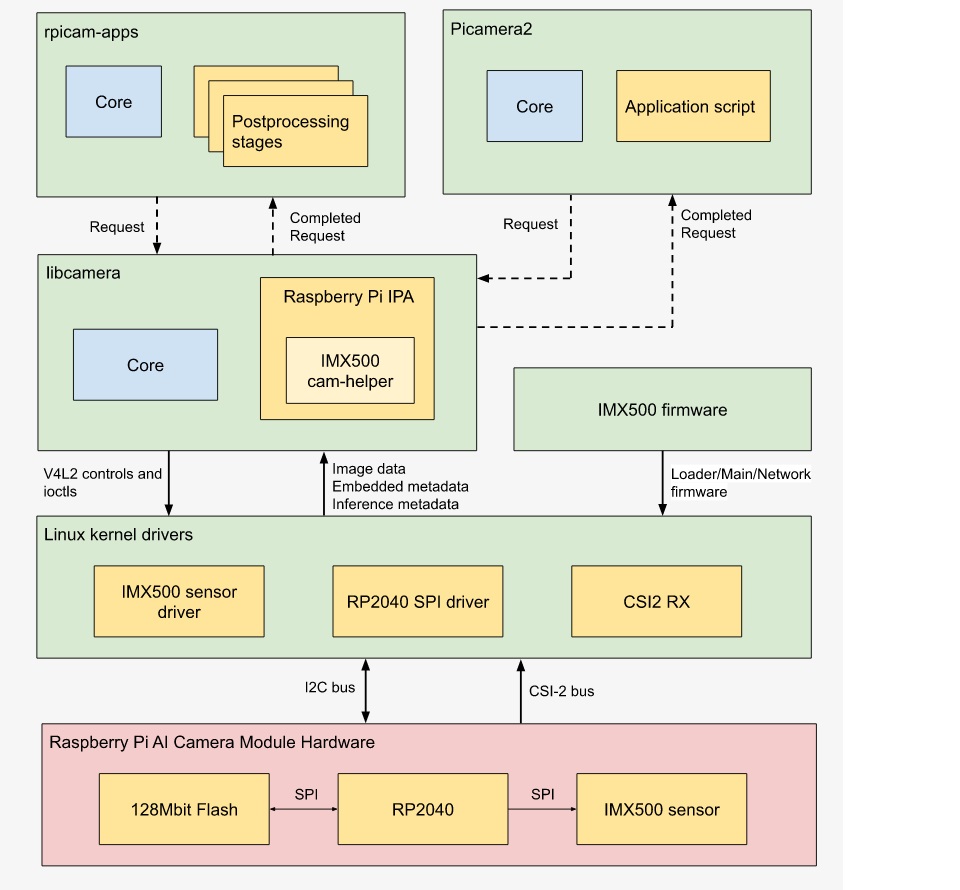На найнижчому рівні драйвер ядра датчика IMX500 конфігурує модуль камери через шину I2C. Драйвер CSI2 (CFE на Pi 5, Unicam на всіх інших платформах Pi) налаштовує приймач на запис потоку даних зображення в буфер кадру, разом з потоками вбудованих даних і даних виведення в інший буфер в пам'яті.