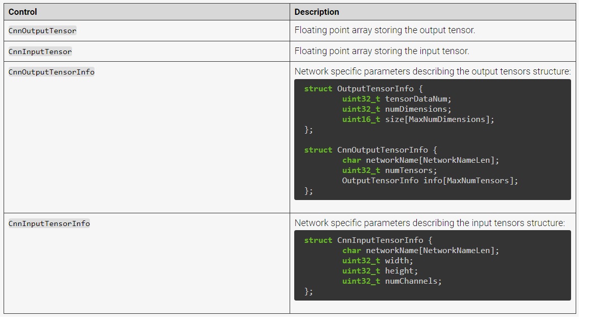 | Read() | Зазвичай ця функція викликається з <Похідного класу>::Read() і зчитує параметри конфігурації для розбору та збереження вхідного тензора. Ця функція також зчитує рядок файлу моделі нейронної мережі («network_file») і налаштовує прошивку для завантаження при відкритті камери. |